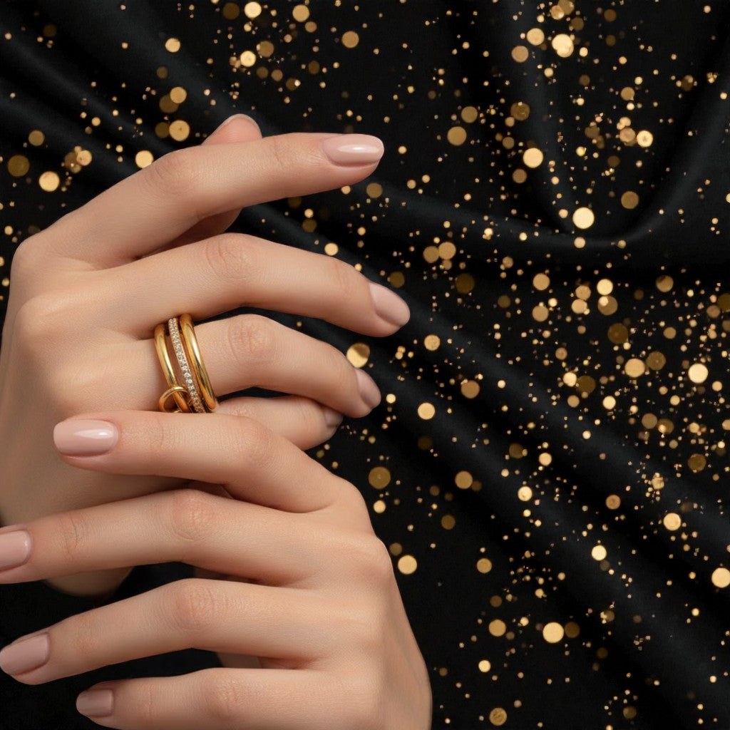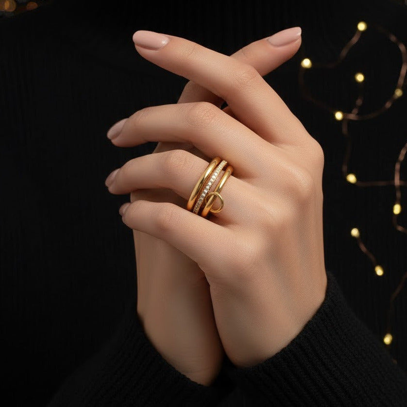 Anillo Dorado "Herencia" de 3 capas, diseñado en acero inoxidable 304 con chapado en oro de 18K. Su estructura geométrica embutida, adornada con circón, refleja elegancia atemporal. Perfecto para el uso diario, este anillo de 7g combina durabilidad con sofisticación. Disponible en talla 7, es la pieza ideal para quien busca un accesorio versátil que trascienda las temporadas, conectando tradición y modernidad en cada detalle.
