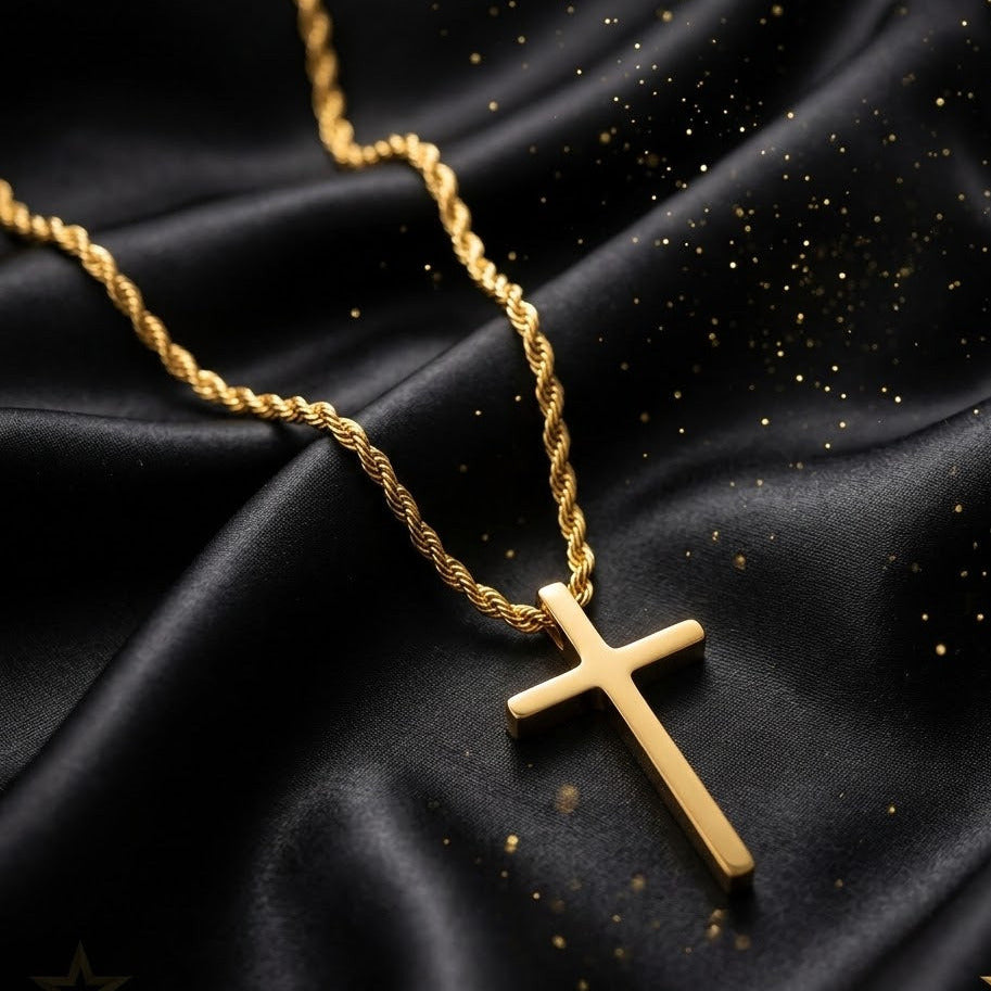 Collar de acero inoxidable 304 con diseño de cruz en estilo vintage y simple. Presenta un colgante enchapado en oro o plateado mediante revestimiento al vacío, perfecto para uso diario. La cadena de cuerda está elaborada en acero inoxidable 304, garantizando durabilidad y resistencia. Con un peso de 23g, es ligero y cómodo de llevar. Ideal para hombres que buscan un accesorio versátil y elegante que combine con cualquier atuendo.