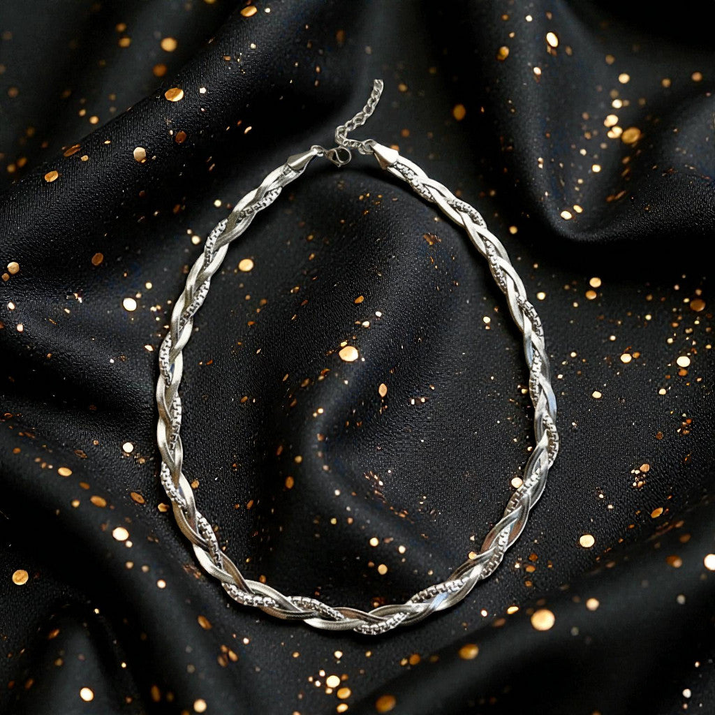 Collar Entrelazado Plateado "Legado" en acero inoxidable 304, diseñado para la mujer moderna que busca elegancia sin compromisos. Su cadena de serpiente chapada en oro de 18k mediante proceso PVD ofrece un acabado sofisticado y duradero, resistente al agua y al deslustre. Con un peso ligero de 20g, es perfecto para usar a diario o en ocasiones especiales. Una pieza versátil que combina artesanía de calidad con un estilo atemporal, ideal para quien valora la belleza y la resistencia en sus accesorios.