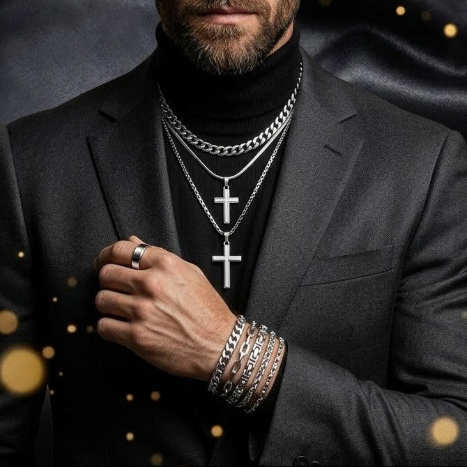 Conjunto de 9 piezas diseñado para el hombre moderno con estilo hip hop. Cada pieza presenta un diseño cruzado y enchapado en plata, con patrones de cruces, coronas y números romanos que reflejan tu personalidad única. Fabricado en acero inoxidable y titanio de alta calidad, garantiza durabilidad y resistencia. Con un peso total de 85g, es cómodo para usar todo el día. Perfecto para completar tu look con un toque de elegancia urbana y actitud.