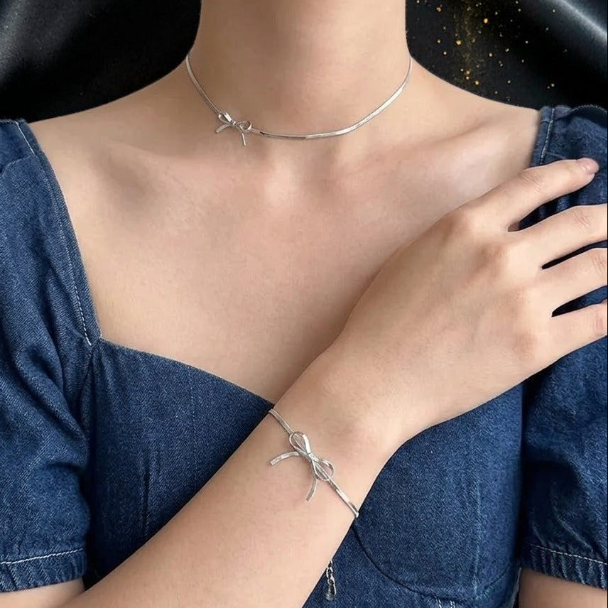 Collar de acero inoxidable 304 con diseño elegante de nudo de lazo, chapado en oro de 18k mediante proceso PVD. Cadena de serpiente delicada que combina estilo simple y clásico, perfecta para uso diario o eventos especiales. Resistente al agua y al deslustre, este accesorio versátil mantiene su brillo sin mantenimiento constante. Pieza única de 2g que se adapta a cualquier ocasión, desde festivales hasta reuniones formales.