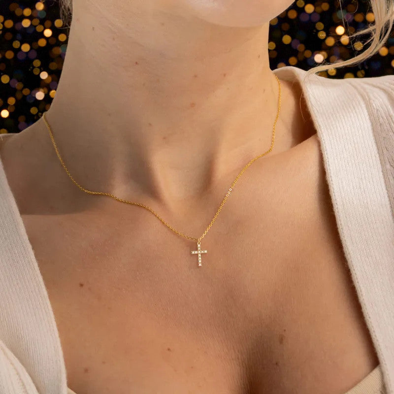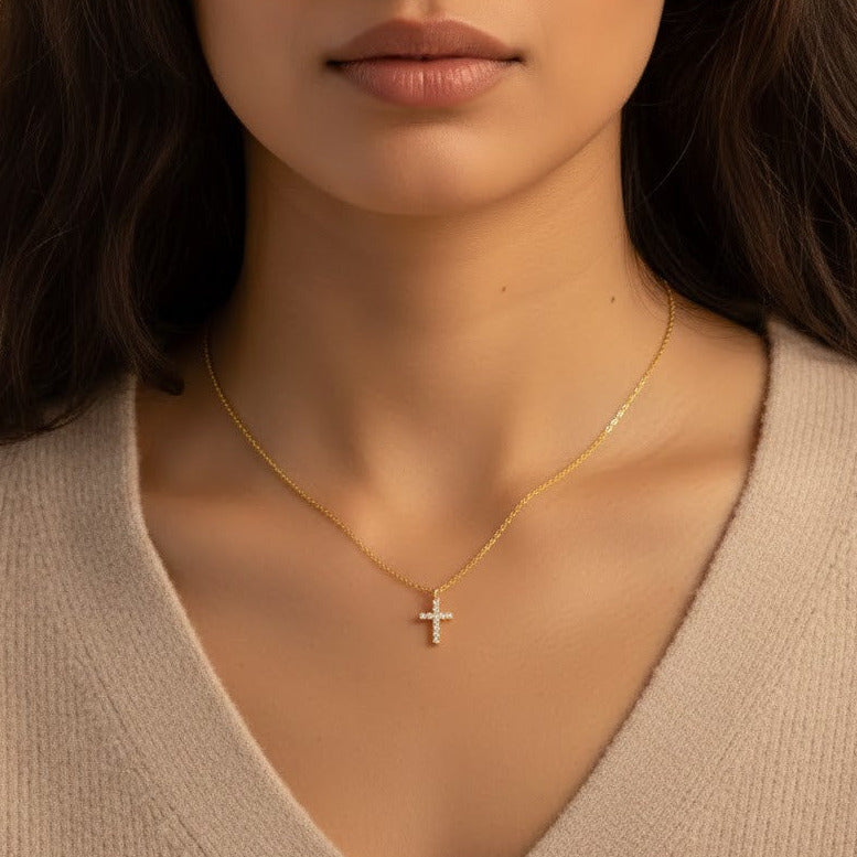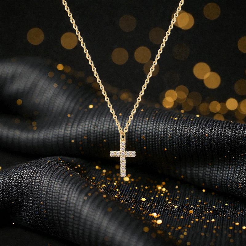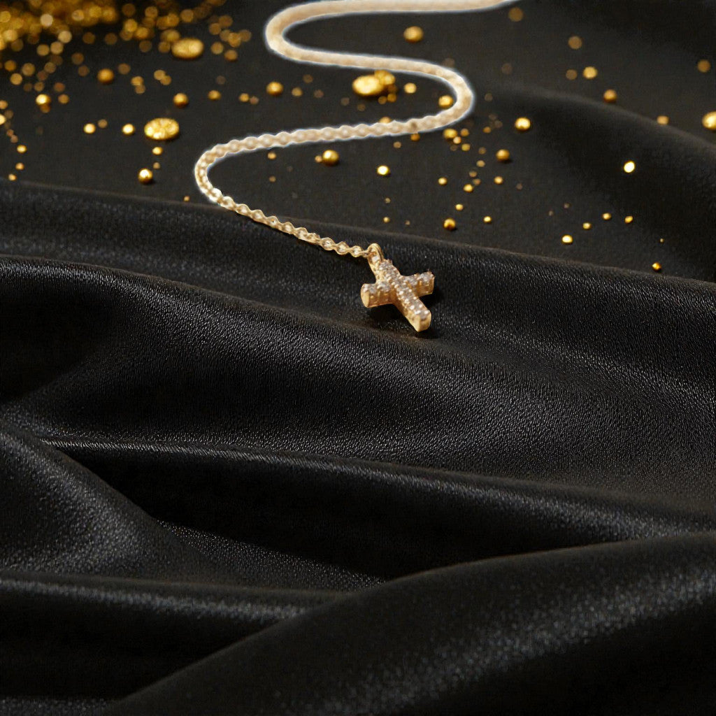 Collar colgante Cruz Satis Dorada, diseñado para mujeres que buscan expresar su fe con elegancia cotidiana. Elaborado en acero inoxidable 304 y cobre, cuenta con un acabado chapado en oro de 18k que le confiere un brillo sofisticado y duradero. El colgante presenta incrustaciones de circón que capturan la luz con delicadeza, mientras que la cadena tipo portacables ofrece resistencia y comodidad. Con un peso ligero de apenas 5g, es perfecta para usar a diario sin comprometer el confort. Su proceso de chapado iónico garantiza un color dorado persistente. Una pieza versátil que combina espiritualidad, estilo y calidad en un accesorio atemporal.