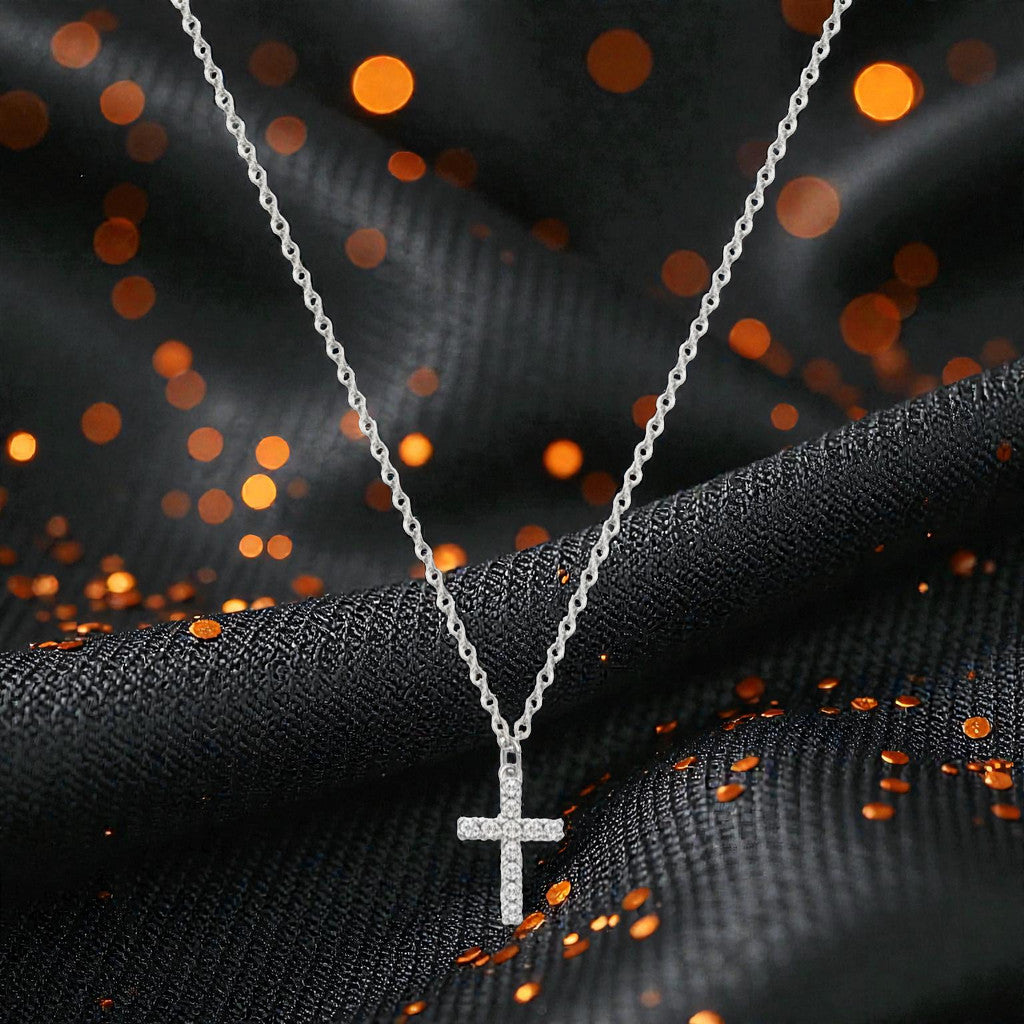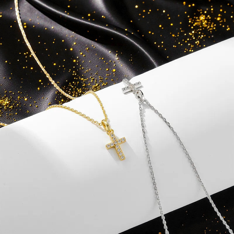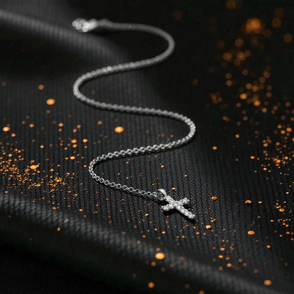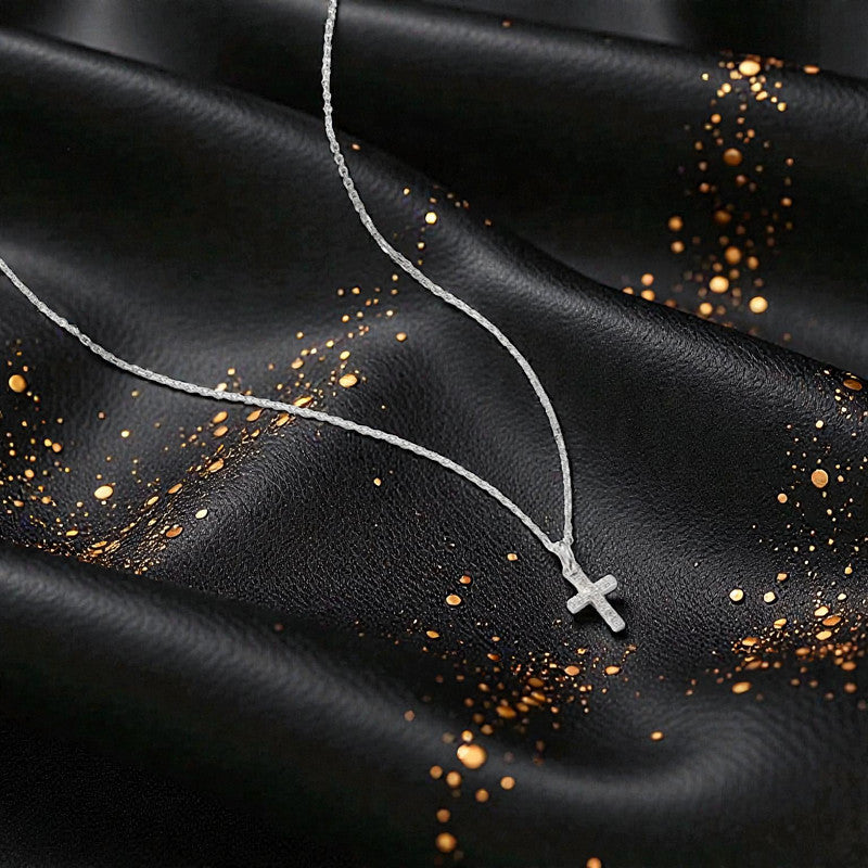 Collar colgante Cruz Satis en plateado, diseñado para la mujer moderna que busca expresar su espiritualidad con elegancia. Elaborado en acero inoxidable 304 y cobre, cuenta con un acabado chapado en oro de 18k que le confiere un brillo sofisticado y duradero. El patrón cruzado y las incrustaciones de circón añaden un toque de luminosidad y distinción. Con un peso ligero de apenas 5g, es perfecta para usar a diario sin comprometer el confort. Su cadena portacables de acero inoxidable garantiza resistencia y durabilidad. Una pieza versátil que combina lo sagrado con lo contemporáneo, ideal para cualquier ocasión.